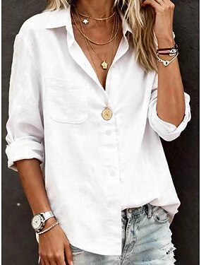 Жен. Рубашки из хлопка и льна Застегните кнопку вверх Длинные хлопковые топы Топ из хлопка белого цвета Карман Пуговицы Полотняное плетение Уличный стиль На каждый день Длинный рукав