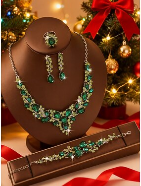 Женский комплект украшений из зеленых кристаллов, 4 предмета: элегантное ожерелье, серьги, браслет &кольцо для рождественских вечеринок, праздничных подарков &официальные мероприятия