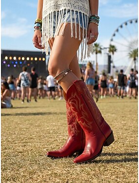 Женские красные кожаные ковбойские сапоги с вышитым узором в стиле вестерн — стильная городская обувь для модных образов
