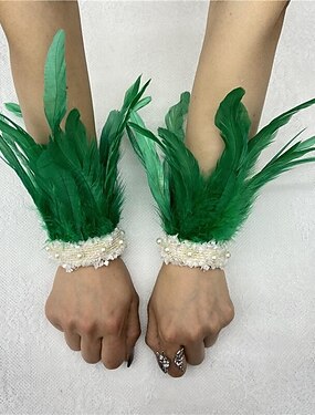 Карнавальный костюм 2026 года. Аксессуары для Рио Карнавала Самба. Женские зеленые перья на запястье с кружевом из белых жемчужин. Костюм для бразильского фестиваля.