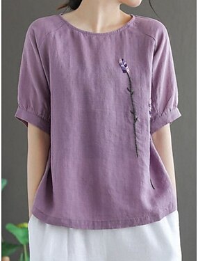 Блуза из хлопка и льна с вышивкой однотонная стильная повседневная с коротким рукавом круглым вырезом обычные топы повседневная белая желтая фиолетовая лето весна