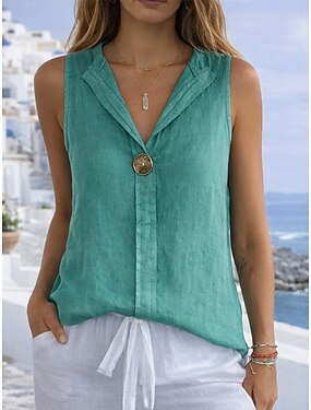 Жен. Рубашка из хлопка и льна Футболка Пуговицы Полотняное плетение Мода Стиль Классика Без рукавов Рубашечный воротник Обычные топы Повседневные На выход выходные Белый Темно синий Зеленый Хаки