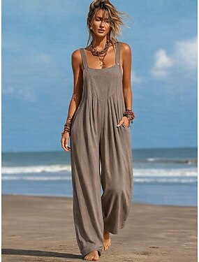Жен. Нормальная Комбинезоны Активный Сплошной цвет Без рукавов Широкие Круглый вырез Карман Повседневные Отпуск Свободное облегание Коричневый Лето
