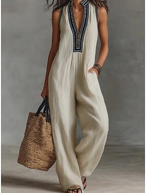 Жен. Нормальная Комбинезоны Активный Сплошной цвет Без рукавов Широкие V-образный вырез Карман Пуговицы Повседневные Отпуск Стандартный Хаки Лето