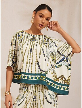 Жен. Блуза Ассиметричный Графика Геометрический принт Винтаж Повседневные На каждый день Рукав до локтя Летучая мышь Вырез под горло Длинные топы Повседневные Праздники Одежда для пляжа