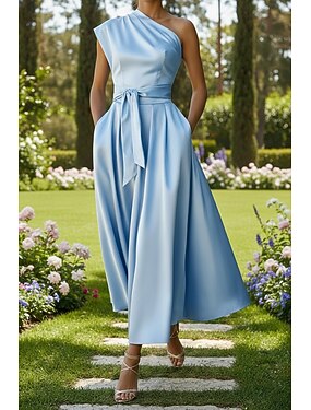 А-силуэт До щиколотки Ниже колена коктейльные платья Элегантный стиль Без рукавов На одно плечо Вечеринка в саду Свадьба Стретч-сатин с Бант(ы) Рюши
