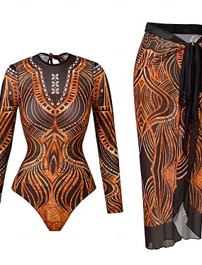 Женский купальник из 1-го предмета стройнящий с юбкой бохо монокини юбка контроль живота высокая талия стройный без спины для отдыха на пляже графический цветной блок округлый вырез длинные рукава