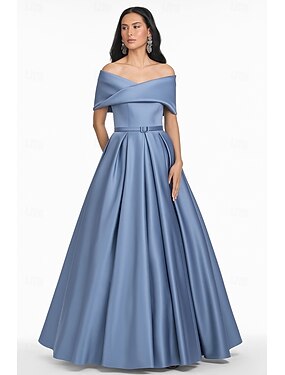 А-силуэт В пол Вечернее платье С пышной юбкой Торжественное платье Элегантный стиль Винтаж Шелковистость С короткими рукавами С открытыми плечами Официальные Свадьба Карман Сатин с Карман