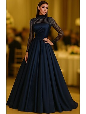 А-силуэт В пол Вечернее платье Торжественное платье Элегантный стиль Блестящая Длинный рукав Вырез под горло Официальные Свадьба Карман Сатин Пайетки с Блеск Плиссировка