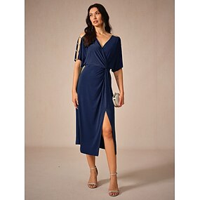 Жен. Платье средней длины Вязаное платье Элегантный стиль Стиль Для вечеринок Свидание Стандартный Сплошной цвет С короткими рукавами V-образный вырез Темно синий Лето