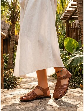 женские коричневые сандалии в рыбацком стиле – винтажные кожаные сандалии на плоской подошве с пряжкой для повседневных летних прогулок и ношения на открытом воздухе