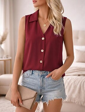 Жен. Летние вершины Топы из шифона Рюши Сплошной цвет Полотняное плетение Элегантный стиль Симпатичные Стиль Повседневные Без рукавов V-образный вырез Обычные топы Повседневные Офис