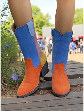 Женские ковбойские сапоги из замши с цветными блоками до середины голени, ботинки в стиле ретро-вестерн на массивном каблуке для музыкальных фестивалей, уличного стиля и образов в стиле бохо