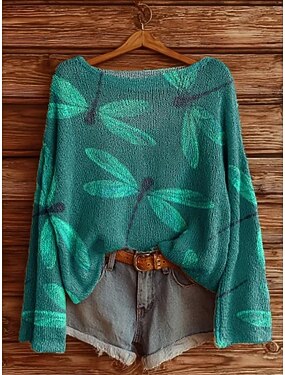 Женский свитер, повседневный, мягкий, с рисунком стрекозы, стильный, современный, с длинным рукавом, круглым вырезом, обычные топы, повседневный, праздничный, с принтом, синий, зеленый, радуга, абрикосовый, весна, осень, зима