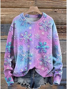 Жен. Вязаная ткань Пуловер Повседневные На каждый день Графика Снежинки Рельефный узор Вырез под горло Трикотаж С принтом Длинный рукав Обычные топы Вязать на открытом воздухе выходные Лиловый