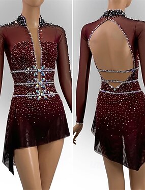 Платье для фигурного катания Жен. Девочки Катание на коньках Платья Черный / красный Пэчворк Открытая спина Сетка Эластичность Учебный Соревнование Одежда для фигурного катания Классика Стразы