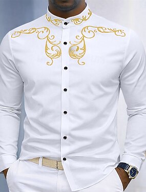 Муж. Рубашка Кнопка рубашка Контрастных цветов Повседневные Бизнес Черный Белый Темно синий Длинный рукав Без воротника Весна Все сезоны Одежда Вышивка