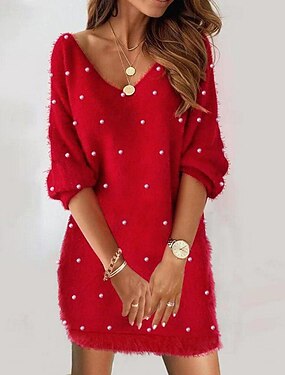 Жен. Мини-платье Рождественское платье Повседневное платье Мода Классика Современное на открытом воздухе Отпуск Праздники Стандартный Полотняное плетение Длинный рукав V-образный вырез Красный Лето