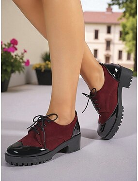 Женские оксфорды бордового цвета из замши и лакированной искусственной кожи на шнуровке с массивным каблуком — винтажный стиль 1950-х годов, идеально подходят для повседневных прогулок, осени и встреч в выходные дни.