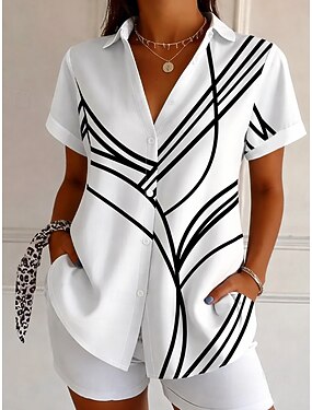 Жен. Рубашка Графика Геометрический принт Винтаж Повседневные Стиль С короткими рукавами Рубашечный воротник Обычные топы Повседневные Черный и Белый Черный Белый Желтый Розовый Лето Весна