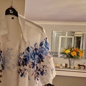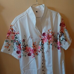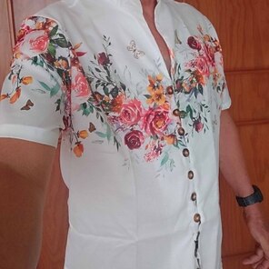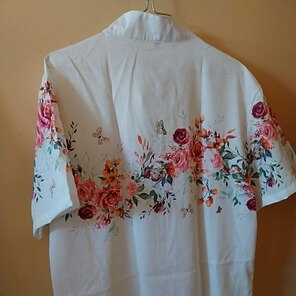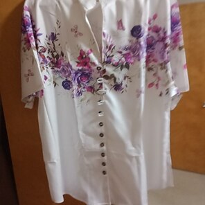 Ткань - полиэстер, но она хорошо висит. Пуговицы плотно сидят в петлях, поэтому я рекомендую быть осторожным. Узор красивый и выглядит как на картинках. Если вы находитесь между размерами, я рекомендую взять на размер больше. Это не стиль, который должен быть очень облегающим, и поскольку это полиэстер, вам нужно немного дополнительного пространства для дыхания.