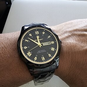 Beautiful look, easy to read date. Came shipped with correct time and date,black and gold the color of Champions and has the weight and feel of an expensive watch and passed the wife test. We love it and recommend this watch to anyone,  Thanks for the great deal!