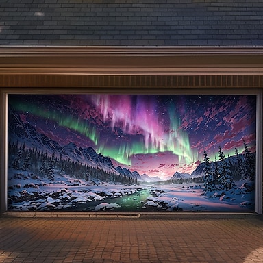северное сияние аврора бореалис зима горы заснеженный сосновый лес звездное ночное небо замерзшая река гаражные ворота баннер наружный декор стен праздничная фреска рождественское украшение фон