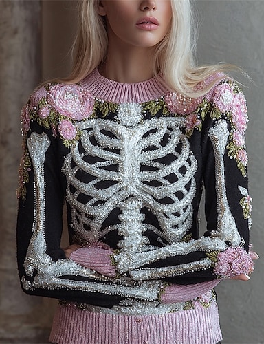 Жен. Вязаная ткань Пуловер Мода Уличный стиль Классический Графика Скелет Рельефный узор Вырез под горло Трикотаж С принтом Украшенный Длинный рукав Обычные топы Вязать Повседневные Праздники На выход