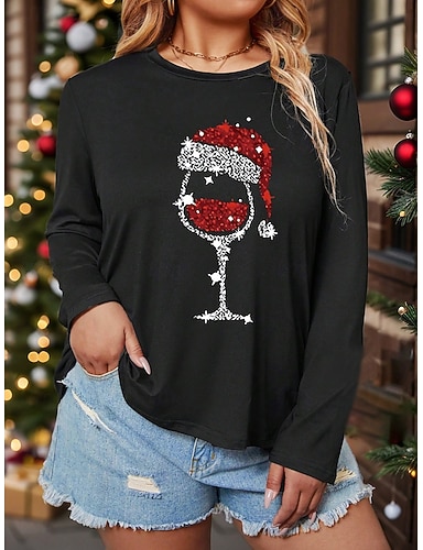 Жен. Большие размеры Верхушки Футболка Новогодняя ёлка С принтом Длинный рукав V-образный вырез На каждый день Повседневные Полиэстер Осень Зима Синий Красный