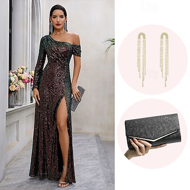 Обтягивающее вечернее платье Элегантный блеск и сияние Petite С юбкой в пол с секвой 3/4 рукавом и платьем на притяжение