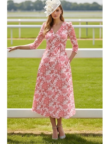 А-силуэт До щиколотки коктейльные платья Платья для вечеринок Элегантный стиль Винтаж Рукав до локтя V-образный вырез Свадьба Официальные Жаккард с Цветочный рисунок Pазрез Карман