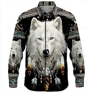 Муж. Волк Ловец снов Этнический Рубашка Кнопка рубашка Длинный рукав Винтаж Ретро на открытом воздухе Отдых и туризм Для охоты Весна Осень Отложной 3D печать рубашки с воротником Черный 1