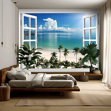 3D-гобелен с видом на тропический пляж из окна, океанский рай, пальмы, песчаное побережье, эстетичный декор комнаты, настенная роспись для спальни.