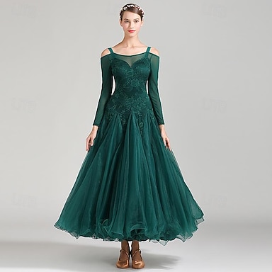 Женское элегантное платье для бальных танцев изумрудно-зеленого цвета с кружевной аппликацией, открытыми плечами и длинным рукавом, для вальса, танго, современной румбы, для выступлений на