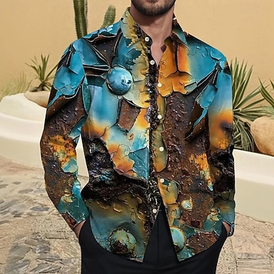 Муж. 3D-печати Состаренная ржавчина Печать Рубашка Кнопка рубашка Длинный рукав Винтаж Ретро на открытом воздухе На каждый день Весна Осень Отложной 3D печать рубашки с воротником Синий