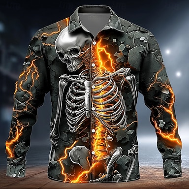 Муж. Черепа Молния Треснувшая лавовая скала Рубашка Кнопка рубашка Длинный рукав Темный готический стиль на открытом воздухе Праздники Лето Весна Отложной 3D печать рубашки с воротником