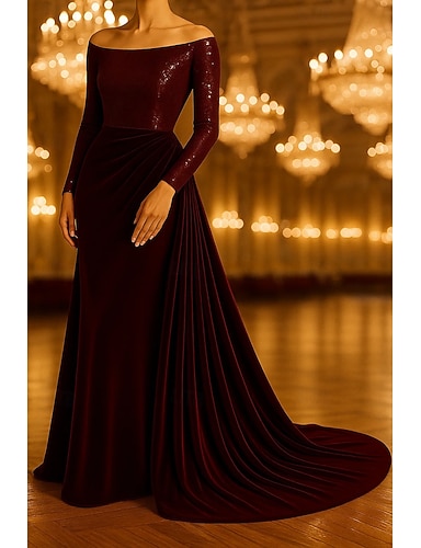 Русалка Со шлейфом средней длины Выпускные платья Вечернее платье С пышной юбкой Торжественное платье Винтаж Блеск и сияние Секси Длинный рукав С открытыми плечами Официальные Свадебный гость