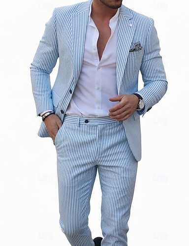 Мужской Смокинги Костюмы из сирсакера Свадьба на пляже Повседневные Розовый Небесно-голубой Лето Костюм Лацкан с тупым углом Легкие На каждый день Полоски Узкий крой Набор из 2 предметов