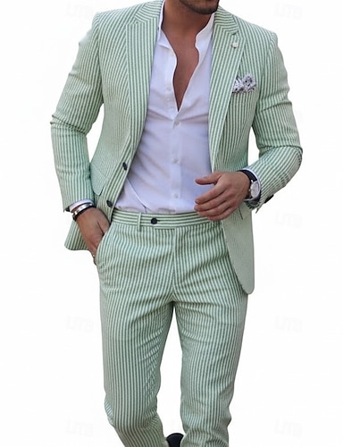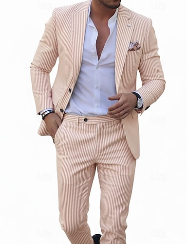 Мужской Костюмы из сирсакера Свадьба на пляже Повседневные Желтый Розовый Весна лето Костюм Лацкан с тупым углом Легкие На каждый день Полоски Узкий крой Набор из 2 предметов Однобортный с 2