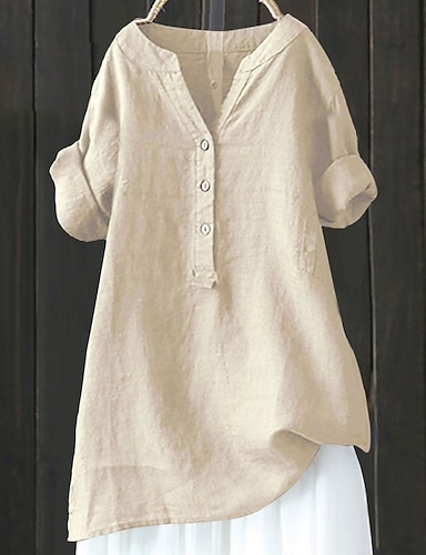 Жен. 100% хлопок Блуза Искусственный хлопок и лен Пуговицы Полотняное плетение Винтаж Стиль На каждый день Длинный рукав V-образный вырез Обычные топы Повседневные Праздники На выход