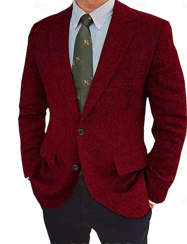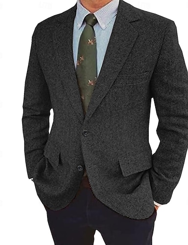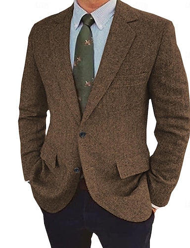 Муж. Твидовый пиджак Воротник с вырезом Ретро В елочку Blazer Темно синий Коричневый Темно-Серый Стандартная посадка Однобортный с тремя пуговицами