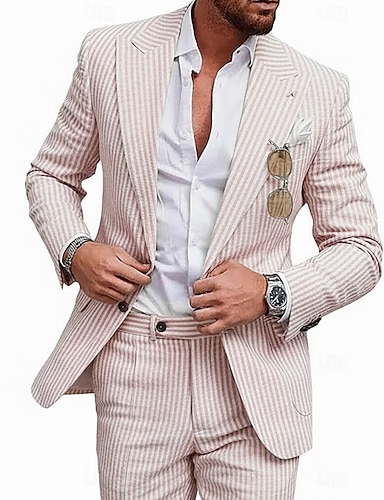 Мужской Костюмы из сирсакера Свадьба на пляже Повседневные Желтый Розовый Весна лето Костюм Лацкан с тупым углом Легкие На каждый день Полоски Узкий крой Набор из 2 предметов Однобортный с 2