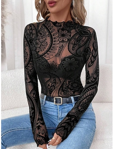 Жен. Блуза Сплошной цвет Стиль На каждый день Длинный рукав Хомут Обычные топы Повседневные Пэчворк Сетка Черный Весна Осень