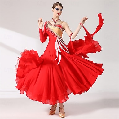 Женское элегантное красное платье для бальных танцев, украшенное стразами, для выступлений вальс, танго, румба, модерн