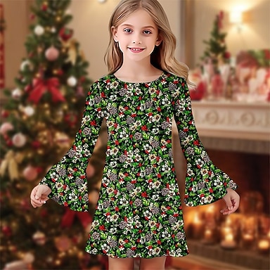 Новогодняя тематика Девушки ' 3D Графика Цветы Платье Платье с рюшами Длинный рукав Лето Весна Отпуск Повседневные Праздники Красивый Милая Дети 4-12 лет Повседневное платье До колена Стандартный