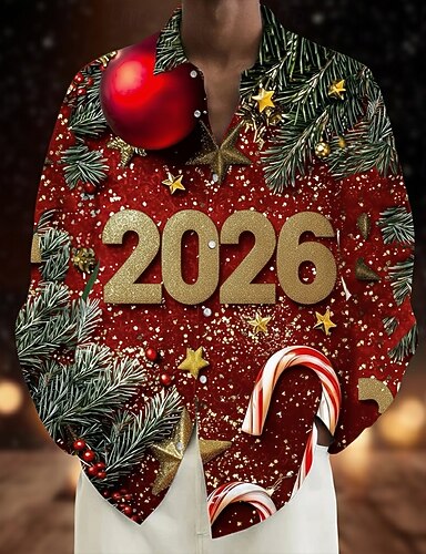 Новый год Муж. с Новым Годом Рождественские елочные шары Рубашка Кнопка рубашка Длинный рукав Веселая на открытом воздухе Праздники Весна Осень Отложной 3D печать рубашки с воротником Синий Красный