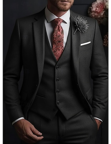 Мужской Свадьба Бизнес Твидовые костюмы Лацкан с тупым углом Черный Бордовый Повседневные Формальная Однотонный Узкий крой Набор из 3 предметов Однобортный с 2 пуговицами