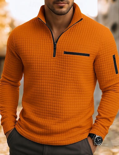 Муж. Рубашки-поло из вафельной ткани Поло с молнией на четверть на открытом воздухе Повседневные Четверть молния Длинный рукав Мода Современное Сплошной цвет Текстура Трикотаж