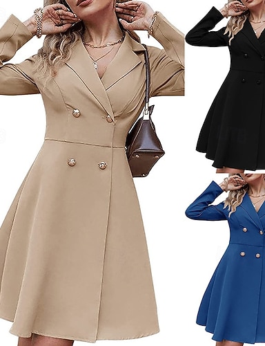 Жен. Платье средней длины Платье-пиджак Мода Современное Отпуск Офис Повседневные Стандартный Полотняное плетение Длинный рукав Глубокий U-образный вырез Рубашечный воротник Черный Синий Верблюжий