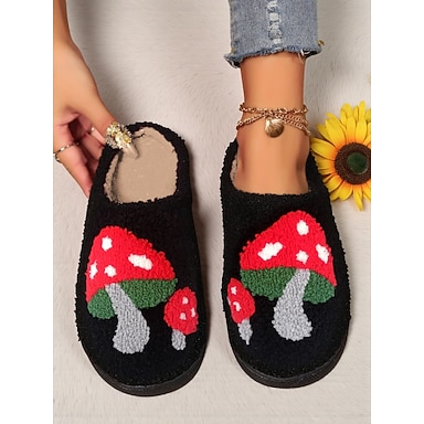 Женские уютные черные пушистые тапочки с рисунком красных грибов, мягкие тапочки для дома и холодной погоды